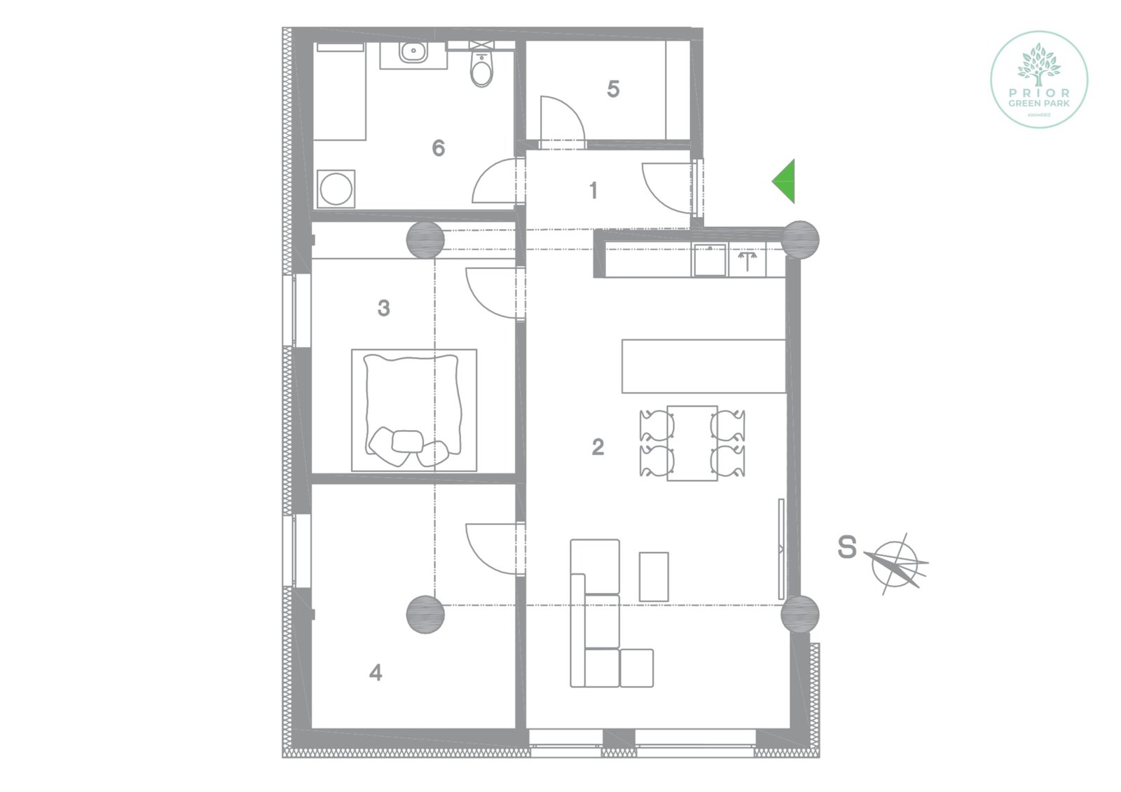 Schéma půdorysu bytu představuje předpokládané dispoziční řešení. Kuchyňské linky, nábytek a interiérové doplňky nejsou předmětem dodávky. Výměry jednotlivých místností jsou pouze orientační. Investor se tímto nevzdává práva na případné úpravy či doplnění marketingového materiálu.