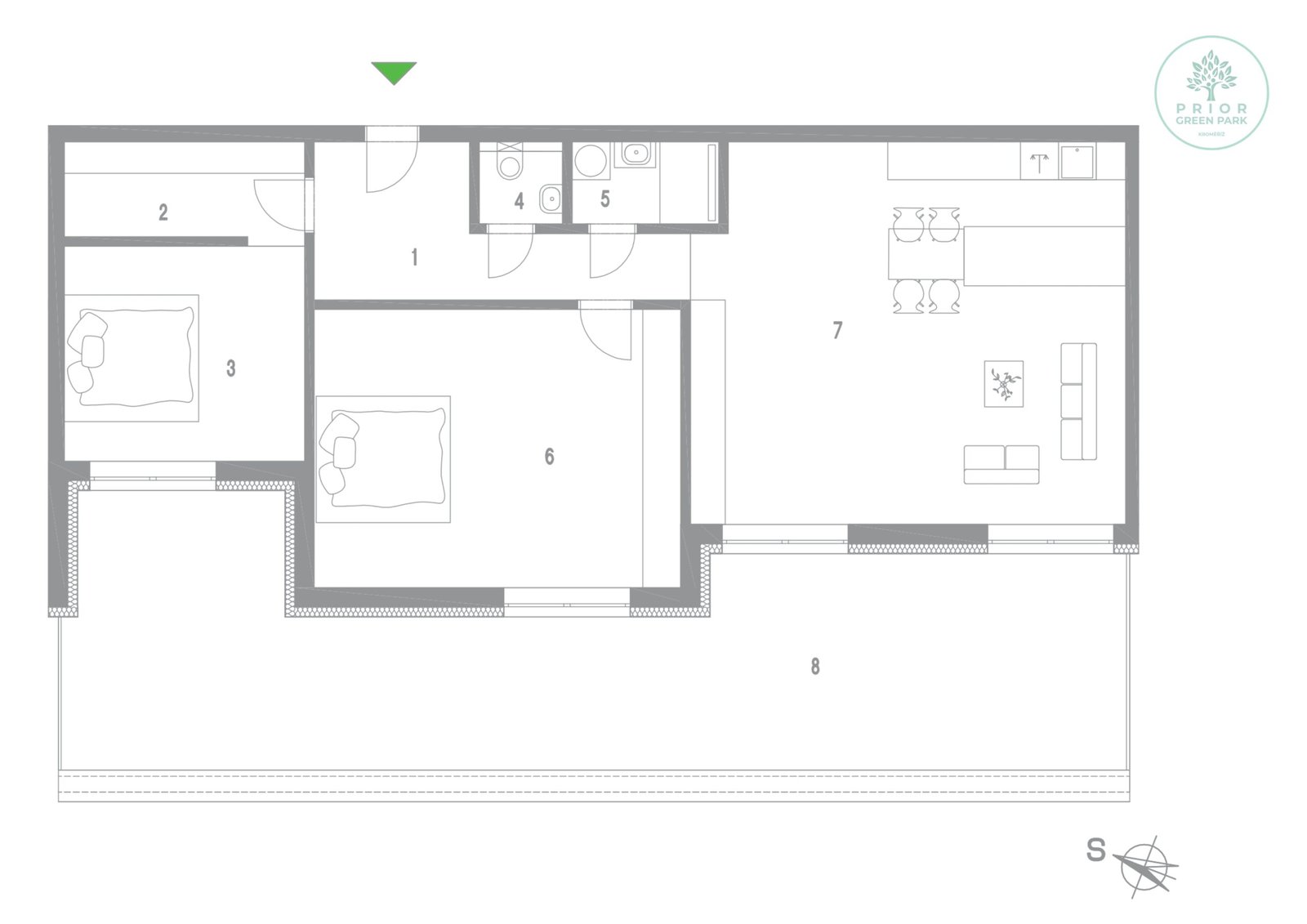 Schéma půdorysu bytu představuje předpokládané dispoziční řešení. Kuchyňské linky, nábytek a interiérové doplňky nejsou předmětem dodávky. Výměry jednotlivých místností jsou pouze orientační. Investor se tímto nevzdává práva na případné úpravy či doplnění marketingového materiálu.